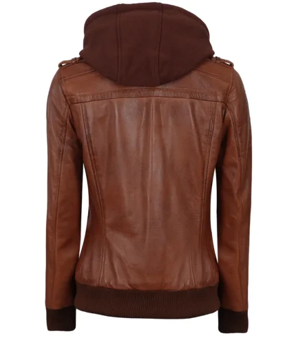 Women’s Bomber Cognac Brown Leather Jacket with Removeable Hood
