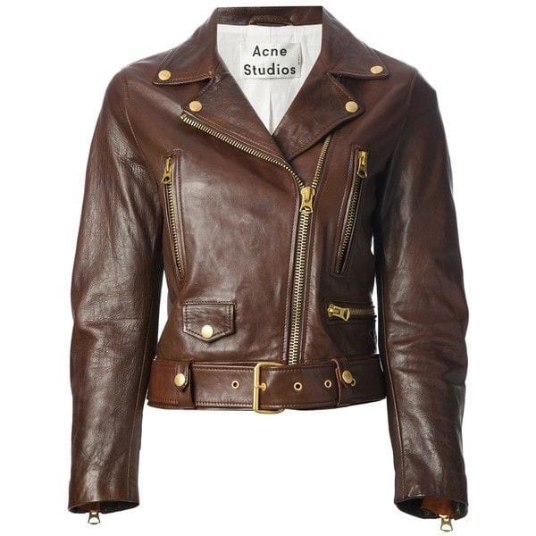 Brown leather biker jacket, vintage style, belted waist, gold hardware, classic and cool.