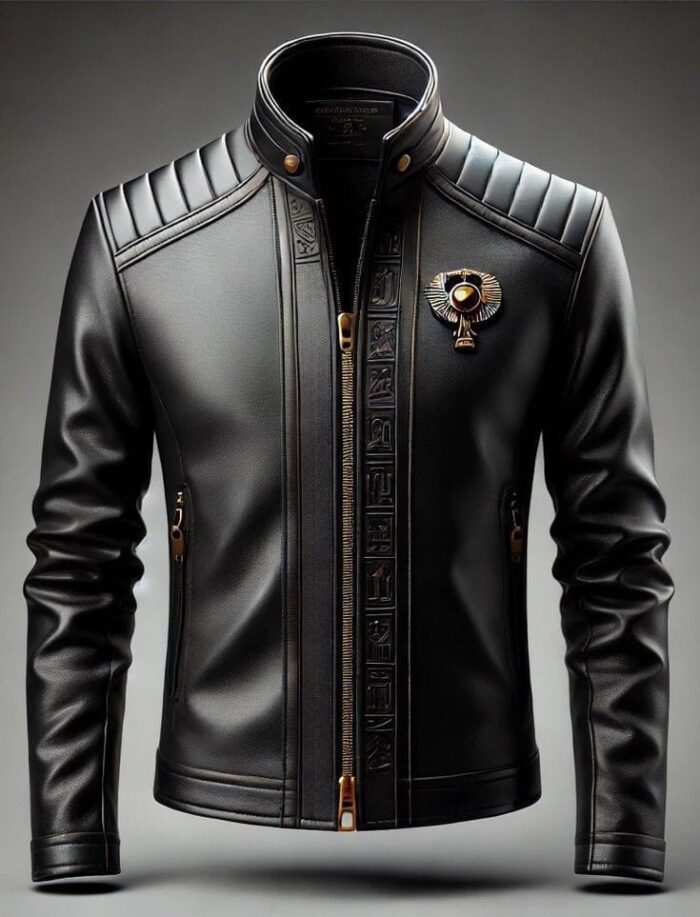 Crafted from premium, supple lambskin leather with intricate detailing and a unique Egyptian-inspired motif, this jacket offers a luxurious feel and statement-making style.