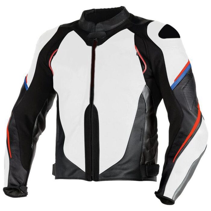 Track-inspired leather jacket, aerodynamic design, bold color blocking, ultimate performance.