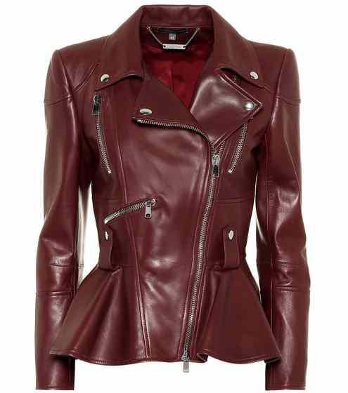 Burgundy leather jacket, peplum hem, asymmetrical zip, moto details, feminine and edgy.