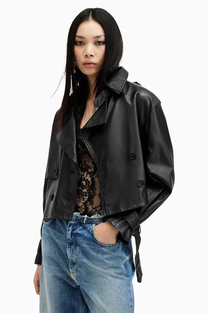 Leather on a different level. The Hendry is a highlight in our new season collection. Crafted from soft leather to a relaxed, cropped double breasted silhouette with drop shoulders. Taking its cues from classic trenches, it features storm flap detailing and wide sleeves that can be adjusted with a buckle fastening. The lightweight leather keeps things easy while the washed technique gives it an authentic vintage look that highlights the natural highs and lows within the leather. Complete with AllSaints metal hardware for the finishing touch – this is how we do leather. This leather jacket is designed to a relaxed fit. Collar. Long sleeve. Cropped. Signature metal hardware. Double breasted. Dropped shoulders. Storm flap. Wide sleeve shaping. Buckle cuffs- adjust these for a cinched or wide sleeve. Washed and tumbled leather. Lightweight soft nappa. Chrome free leather. Recycled lining.