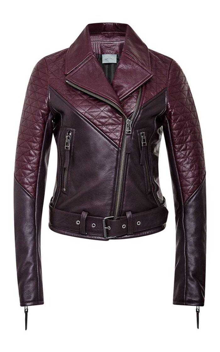 Burgundy, quilted leather moto jacket, belted waist, asymmetrical zip, chic style.