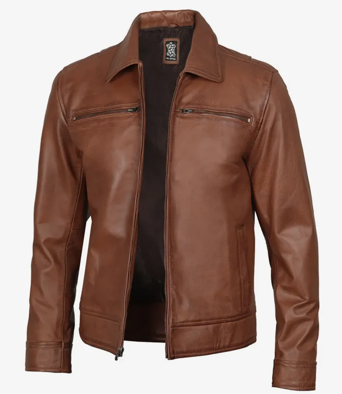 Men’s Cognac Brown Leather Jacket- Shirt Collar Style