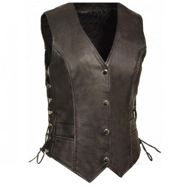 Ladies Snap Front Vest W/ Thin Braid. Butter Soft Naked Cowhide 1.2-1.3mm Classic Four Snap Front Look Ultrathin Leather Braiding Detail Across The Front & Back Two Lower Pockets W/ Updated Side Lace Detailing Two Deep Interior Storage Pockets