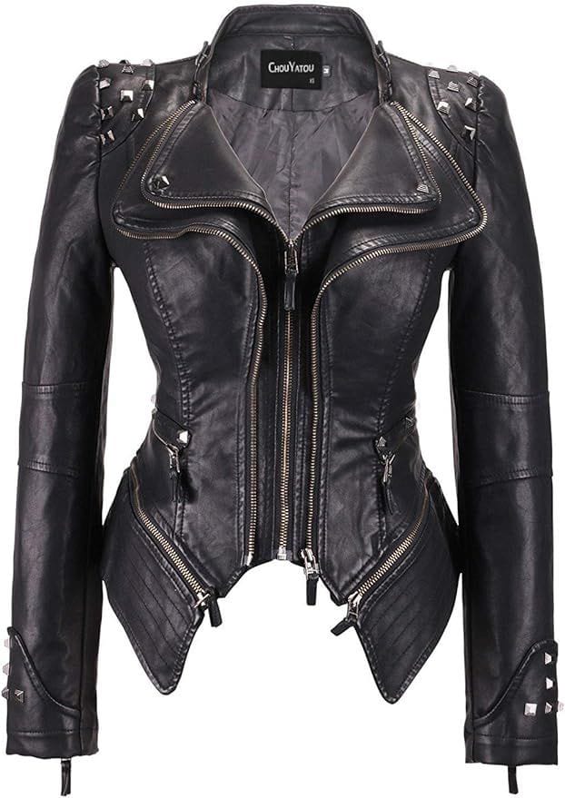 Edgy, studded black moto jacket, asymmetrical zip, fitted silhouette, statement style.