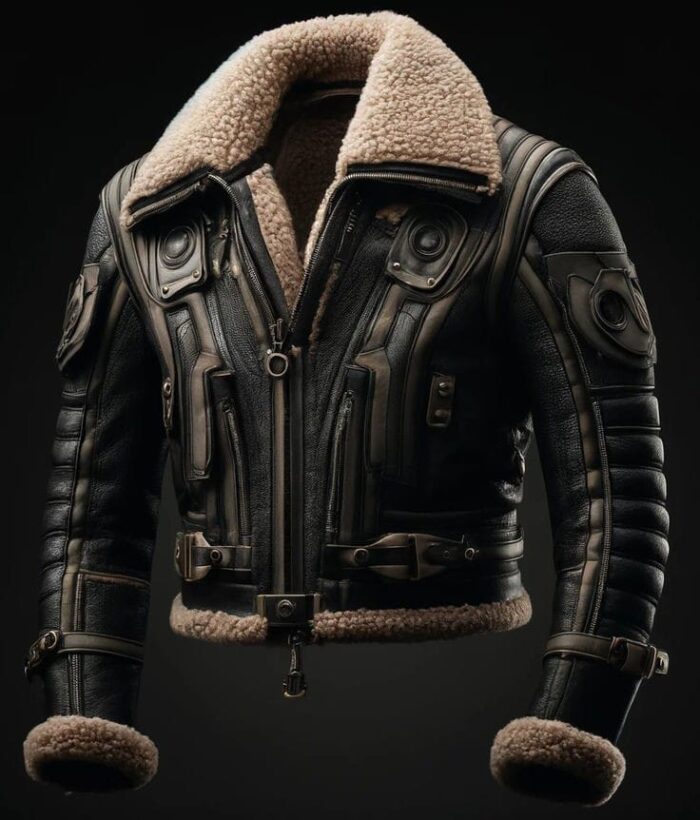 This commanding piece is crafted from rugged, premium leather, featuring a distinctive, weathered aesthetic and bold design elements. The luxurious shearling collar adds a touch of opulence, while the multiple pockets and adjustable closures provide practicality and versatility.