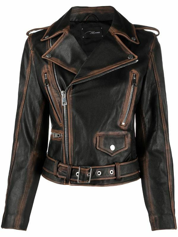 Brown distressed leather jacket, vintage look, belted waist, asymmetrical zip, rugged and stylish.