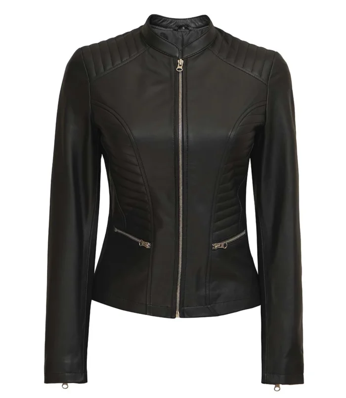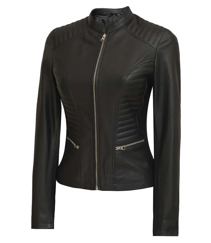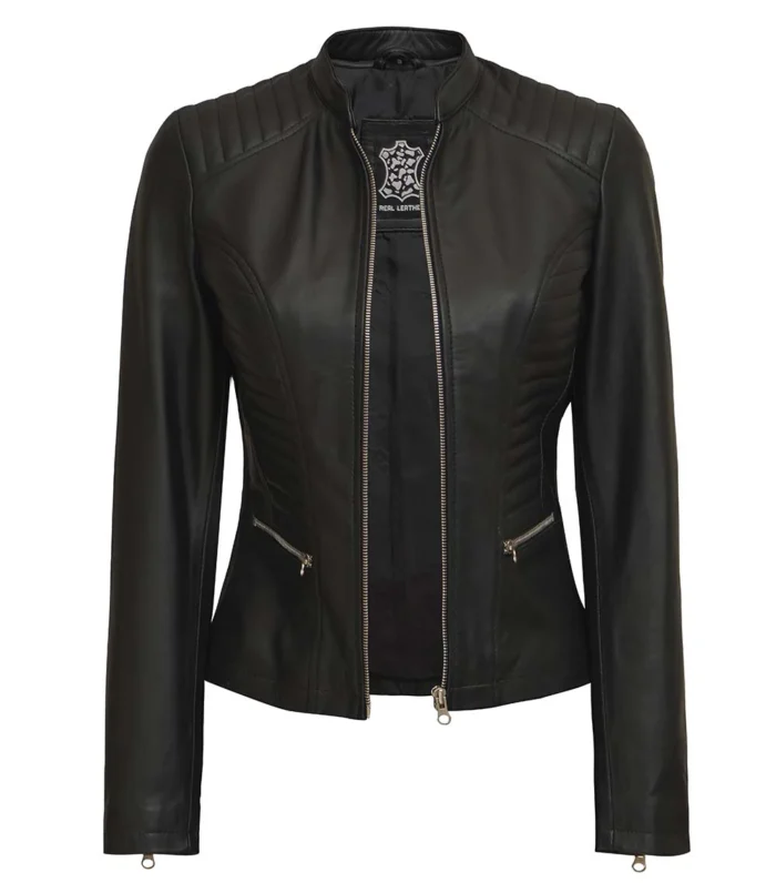 Feel retro vibes in this black cafe racer style leather jacket for women. A quality product in 100% real lambskin leather that will stand a test of time featuring padding details, upright collar and two exterior zipper and one inside pocket for storage. Easy to wear and design for everyday run.