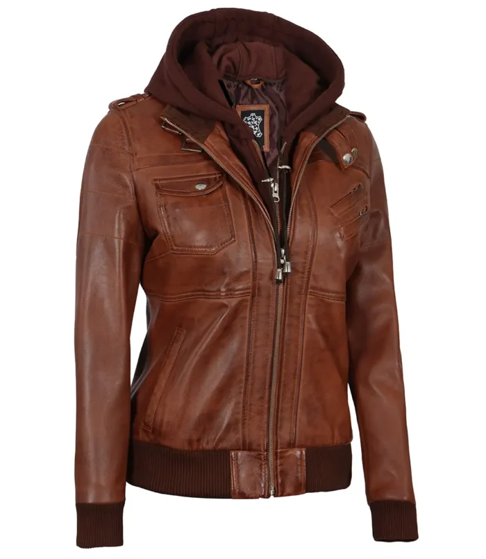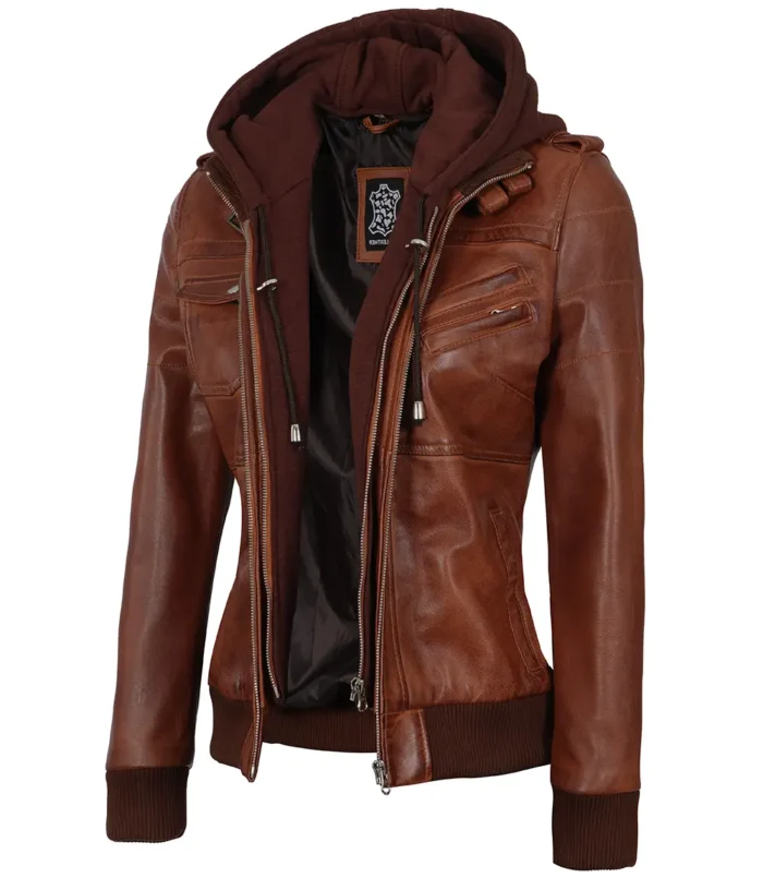 This women’s cognac hooded bomber leather jacket is the perfect addition to any fashion-conscious woman’s wardrobe. Made from high-quality leather, it is durable and the overall design of the jacket is chic and casual, making it easy to pair with a variety of different outfits.